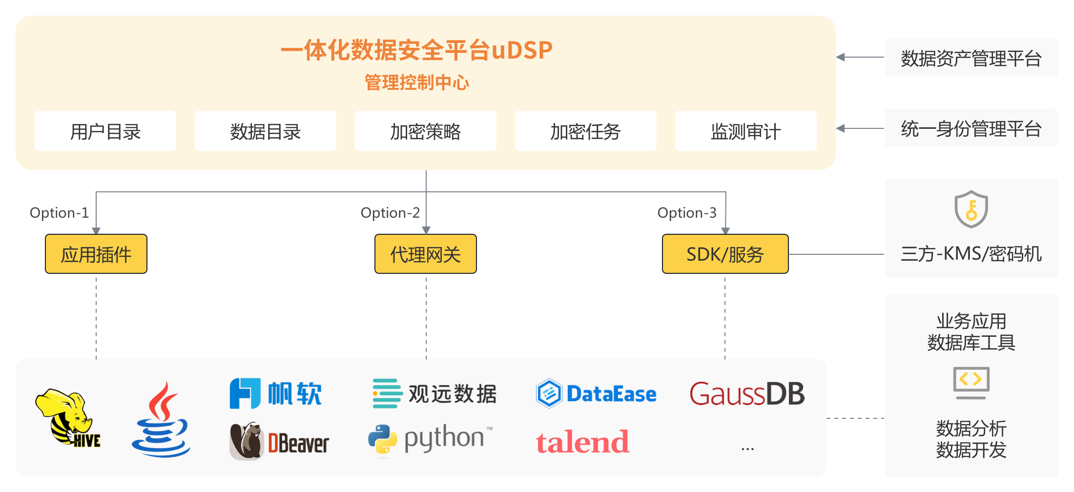 简化安全管理将安全问题缩小到密钥管理问题,支持对接三方KMS或密码机服务器保证密钥安全,给予AES、SM4、FPE加密算法,兼顾安全与数据使用需求。